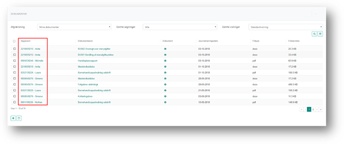 Fra fanen Dokumenter kan du gå ind på den sag, som et dokument er tilknyttet. Dette gør du ved at klikke på linket i kolonnen Sagsnavn.