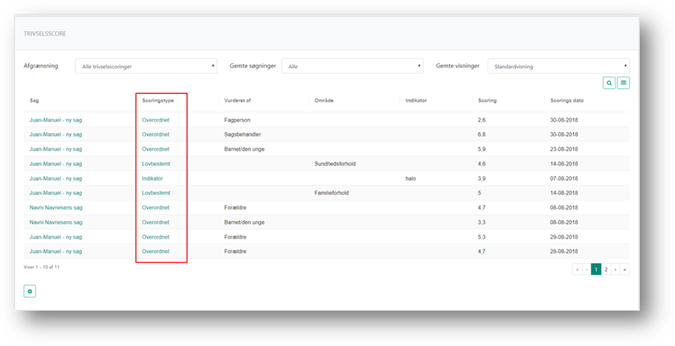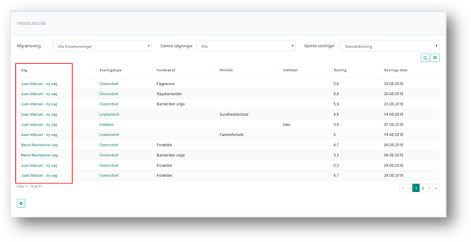 Fra Trivselsscoreoversigten kan du navigere ind på den sag scoren er afgivet på, ved klik på linket i kolonnen Sag. Her kan du se alle afgivne scoringer, på tværs af sager.