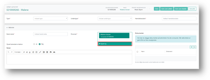 Du kan oprette en person direkte fra en aktivitet ved at klikke i feltet ’Personer’, og derefter klikke på ’Opret ny’.