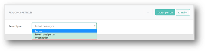 Systemet åbner en ny side, hvor du kan vælge, hvilken type person du ønsker at oprette. Dette gøres ved at klikke på feltet Persontype og vælge en af de tre muligheder i rullemenuen.