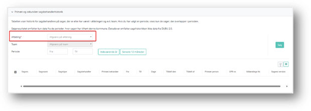I fanen primær og sekundær sagsbehandlerhistorik har du mulighed for at fremsøge en samlet historik over hvilke sagsbehandlere, der har haft hvilke sager for én af kommunens afdelinger.