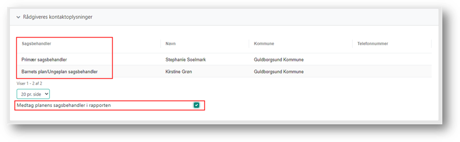 Hvis begge rådgivere skal fremgå af udskriften af planen, skal du markere ’Medtag planens sagsbehandler i rapporten’.