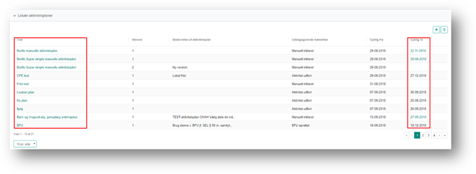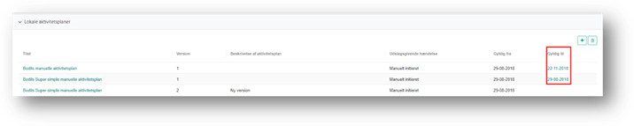 Hvis du eller en anden superbruger i kommunen har oprettet en fremtidig version af aktivitetsplanen, kan du åbne den via linket i Gyldig til kolonnen.