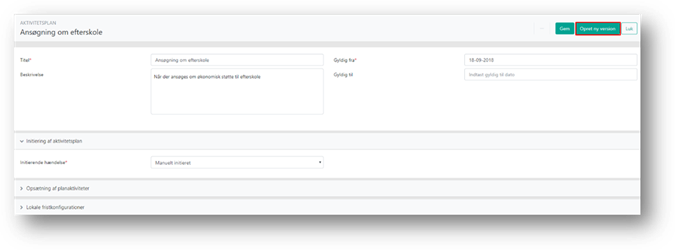 Du har mulighed for at oprette en ny version af aktivitetsplanen i stedet for at redigere den eksisterende aktivitetsplan. Fordelen vil være at du kan se en klar historik på ændringer i aktivitetsplanen og hvis en ny lokal frist eller aktivitet først skal anvendes fra en bestemt dato, kan der forberedes en ny version af aktivitetsplan med en gyldig fra dato fra den konkrete dato.