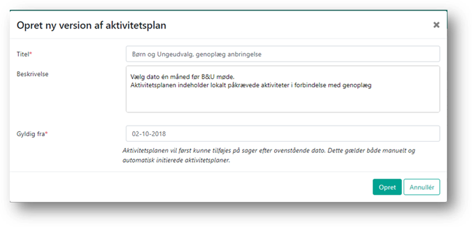 Systemet åbner den nye version af aktivitetsplanen, som kan udfyldes på samme måde som ved oprettelse, dette er beskrevet i afsnittet Opret aktivitetsplan. Samtidig sættes Gyldig til datoen på den oprindelige aktivitetsplan til den angivne Gyldig fra dato på den nye version.