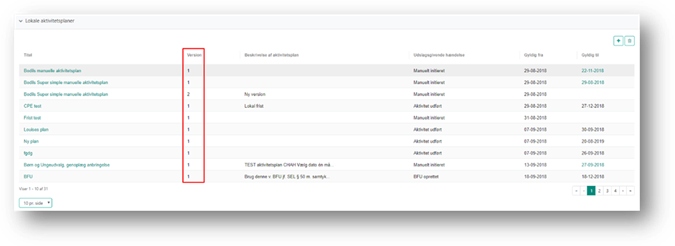 I kolonnen Version på oversigten over lokale aktivitetsplaner kan du se hvilken version af aktivitetsplanen der er aktiv.