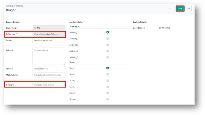 Redigeringssiden er identisk med oprettelsessiden, dog er det ikke muligt at ændre fulde navn, hvis brugeren har været logget ind. Det er desuden muligt at tilføje Gyldig til dato.