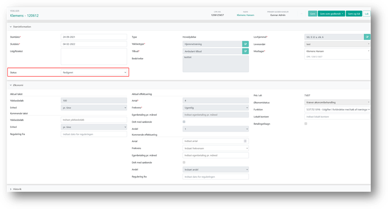 Når du har trykket på ’Rediger’ sættes status til Redigeret og gør felterne redigerebare.
