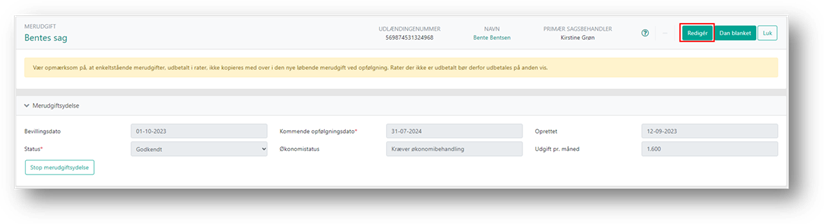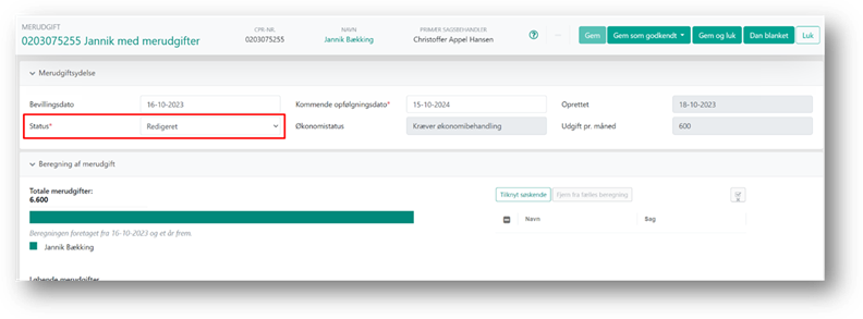 Ønsker du at redigere en godkendt merudgiftsydelse, gøres dette ved at klikke på Redigér under merudgiftens menu. Når der klikkes på knappen, skifter merudgiftsydelsen og de tilknyttede godkendte enkeltstående merudgifter status til ’Redigeret’.
