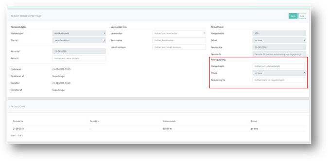 Hvis du, eller en anden superbruger i din kommune, angiver en takst ved oprettelsen af den tilbudte ydelse, er det muligt for dig at regulere denne takst, dvs. at ændre den fra en given dato. For eksempel hvis du ved at den valgte leverandør sætter prisen for ydelsen op pr. den 1. Ændringen vil da automatisk træde i kraft den valgte dato.