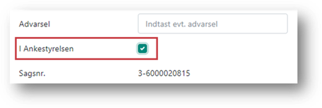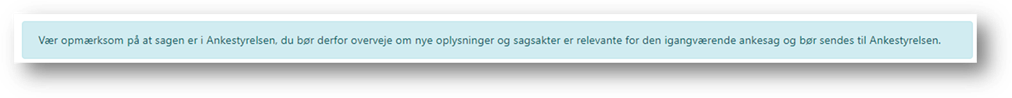 I Ankestyrelsen – her kan du afkrydse om der er en igangværende sag i Ankestyrelsen. På den måde vil du på sagen blive gjort opmærksom på evt. at eftersende nye sagsakter, som kan være relevante for Ankestyrelsen. Når feltet markeres, vises en informationsbjælke øverst på sagen.