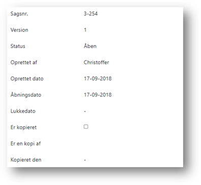 Foruden de redigerbare felter består Sagsoplysninger også af systemsatte felter. Disse felter kan ikke redigeres.