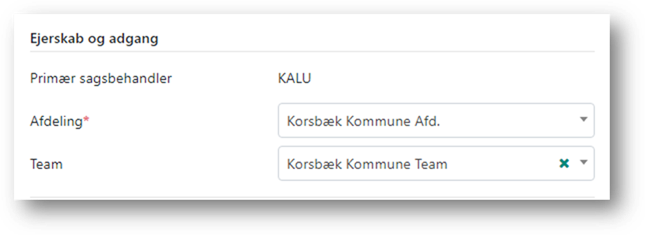 Team – her fremgår, hvilket team sagen tilhører. Hvis sagen skal tilhøre et andet team, kan du ændre team her. Du kan vælge mellem alle teams i kommunen. Det er ikke krævet at tilknytte et team til en sag. Du skal kun tilknyttes et team, hvis det passer ind i din kommunens struktur.