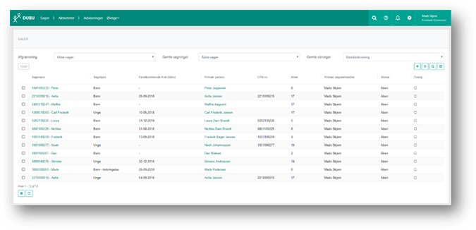 På sagsoversigten kan du danne dig et overblik over sagerne herunder hvert sagsnavn, sagstype, navnet på barnet/den unge og sagens status.
