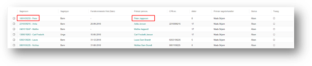 I sagsoversigten er der links i kolonnerne Sagsnavn og Primær person. Når du klikker på en af disse, navigeres du til hhv. Sagen og Persondetaljesiden for sagens primære person.