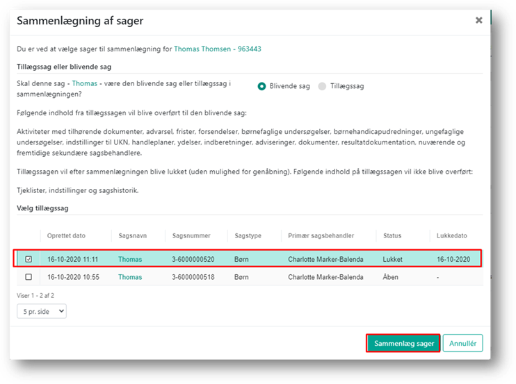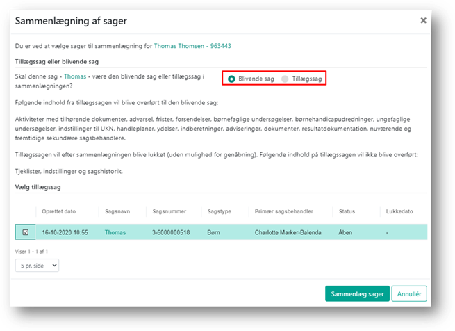 •Når du vælger den blivende sag, skal du være opmærksom på, om der er forhold der taler for at benytte en sag med et specifikt sagsnummer. Eksempelvis kan familien tidligere have modtaget breve og dokumenter med dette sagsnummer, og der er blevet overført en ny sag fra en anden kommune, her vælges den overførte sag, som tillægssag, så al indhold samles på den eksisterende sag.