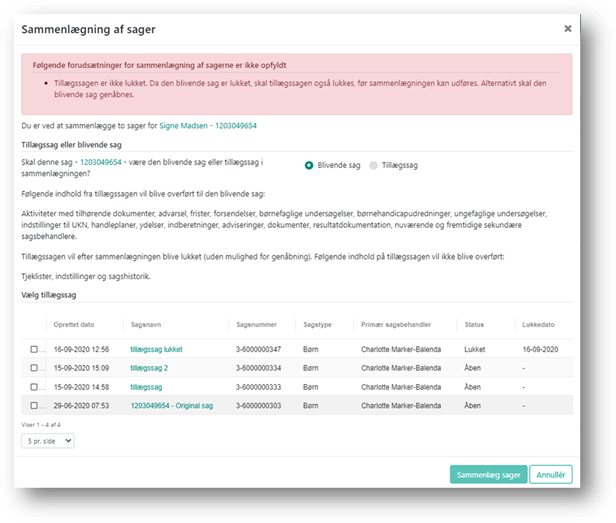 Når sagerne er lagt sammen, vil indhold fra tillægssagen være overført til den blivende sag. Vær opmærksom på at systemet ikke ændrer i navngivning på indholdet. Det betyder, at der fx kan være flere historiske undersøgelser eller handleplaner, som hedder det samme.
