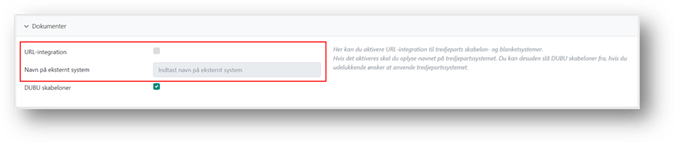 Hvis din kommune har en aftale med et eksternt skabelon- og blanketsystem, der understøtter DUBU, kan du fra DUBU tilknytte det eksterne system ved at markere tjekboksen URL-integration. Når du har markeret tjekboksen, skal du angive det navn, som skal vises i systemet, når brugerne opretter dokumenter i systemet.