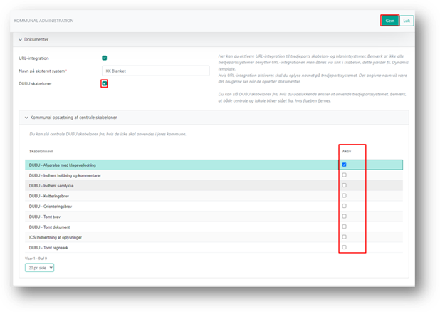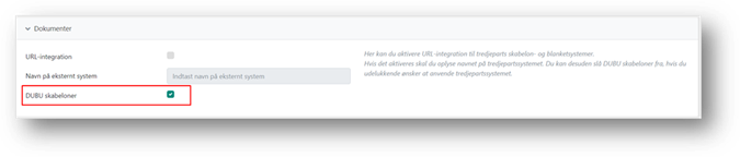 Hvis du vælger at fjerne markeringen i boksen, er det ikke muligt at oprette dokumenter fra DUBU skabeloner.