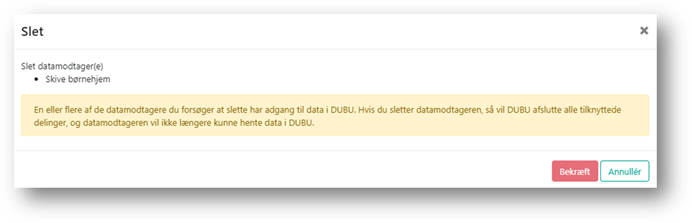Hvis du sletter en datamodtager, som har adgang til oplysninger i DUBU, som ikke er afsluttet, vil du få en advarsel omkring dette, inden du bekræfter sletningen.