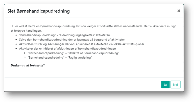 Bemærk at følgende vil blive slettet sammen med aktiviteten ”Børnehandicapudredning” – ”Udredning igangsættes”: