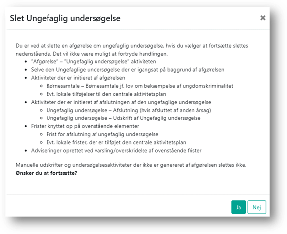 OBS på hvis din kommune har lokalt oprettede aktivitetsplaner med initierede aktiviteter på baggrund af afgørelsen om ungefaglig undersøgelse, vil disse aktiviteter også blive slettet ved sletning af afgørelsen.