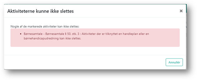 Hvis der er en eller flere af de aktiviteter der er initieret af den ungefaglige undersøgelse, der ikke kan slettes – fx en børnesamtale der også er tilknyttet en handleplan, eller udskriften af den ungefaglige undersøgelse indgår i en forsendelse (og du ikke har rettigheder til at slette aktiviteter med forsendelse) – så vil resten af sletningen blive gennemført, men de blokerede aktiviteter forbliver på sagen.