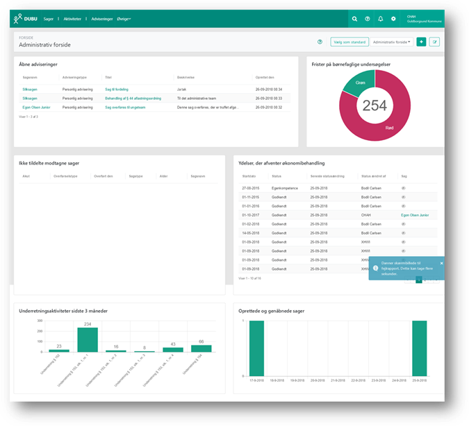 •Underretningsaktiviteter sidste 3 måneder: hvor du får vist søjlediagram over underretningsaktiviteter pr. type med hændelsesdato indenfor de sidste 3 måneder.