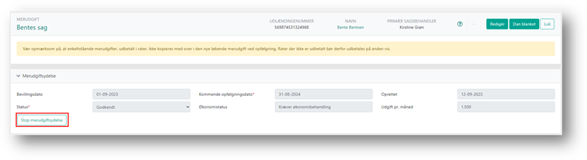 Du stopper en merudgiftsydelse uden at lave opfølgning, ved at klikke på ’Stop merudgiftsydelse’ under fanen ’Merudgiftsydelse’.