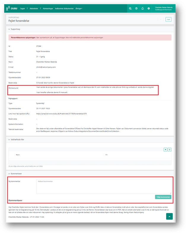 Når en supportsag er oprettet, kan du tilføje yderligere oplysninger på sagen ved at tilføje vedhæftede filer eller tilføje kommentarer på sagen. Du tilføjer en kommentar ved at udfylde feltet Ny kommentar og klikke på knappen Tilføj kommentar. Det er også muligt at tilføje kommentarer og vedhæfte filer til supportsager, som er oprettet af andre.
