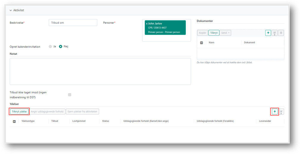 Hvis barnet/den unge eller familien ikke har taget imod tilbuddet, skal du markere feltet ’Tilbud ikke taget imod (ingen indberetning til DST)’. I det tilfælde er det ikke nødvendigt, at du tilknytter en ydelse til aktiviteten.