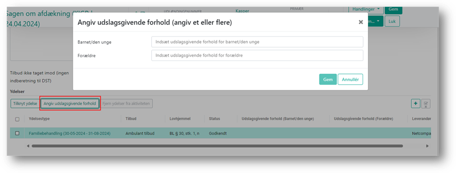 Når du har tilknyttet en ydelse, skal du angive det eller de udslagsgivende forhold for iværksættelsen af indsatsen Det gør du ved at klikke på ’Angiv udslagsgivende forhold’, og herefter kan du vælge udslagsgivende forhold for både barnet/den unge og/eller forældre.