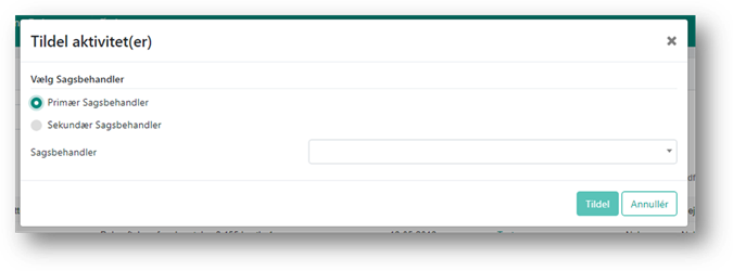 Hvis det er en anden end den sagsbehandler, der har oprettet aktiviteten, som skal behandle den enkelte aktivitet, er det muligt at tildele aktiviteten til den pågældende sagsbehandler. Hvis der er flere sagsbehandlere om én aktivitet, er det også muligt at tildele til en eller flere sekundære sagsbehandlere.