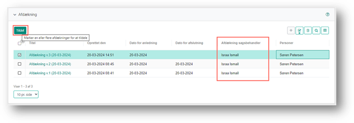På fanen ”Afdækning” vælger du afdækningen, som skal tildeles og klikker på Tildel. Du får nu mulighed for at vælge den rådgiver afdækningen skal tildeles til.