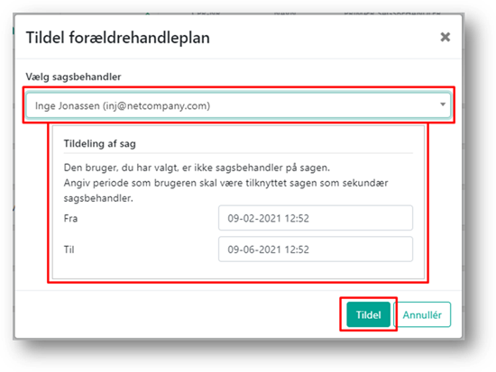 Når du har klikket på Tildel åbnes en boks, hvor du i feltet Vælg sagsbehandler kan fremsøge den sagsbehandler, handleplanen skal tildeles til. Hvis sagsbehandleren ikke er primær eller sekundær sagsbehandler på sagen, vises felterne for tildeling af sag, hvor du skal tildele sagsbehandlerens som sekundær sagsbehandler på sagen. Bemærk at det er muligt at tildele sagen uden slutdato, ved at lade ’Til’ være tomt.
