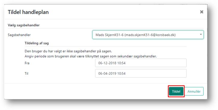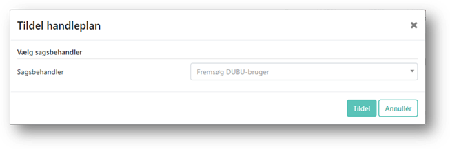 Når du har klikket på ”Tildel” åbnes en boks, hvor du kan fremsøge den sagsbehandler, planen skal tildeles til.