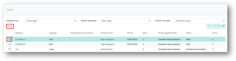 Fra sagsoversigten tildeler du en sag ved at markere en eller flere sager. Når du har markeret sagerne, vil knappen Tildel blive aktiv.