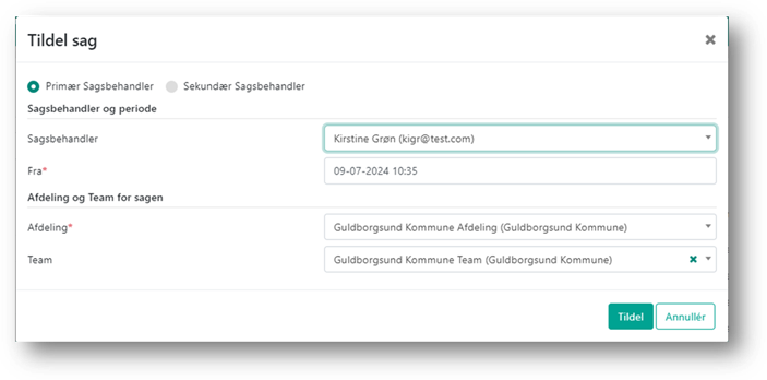 Når du klikker på Tildel åbnes et vindue, hvor du skal vælge om sagen skal tildeles til en primær eller sekundær sagsbehandler.