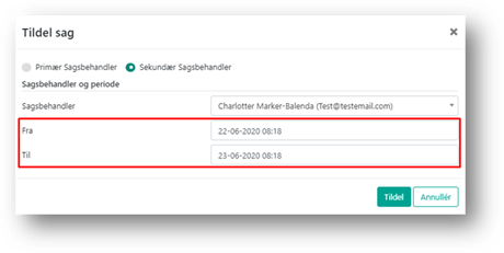 Du skal vælge hvilken periode, hvor den sekundære sagsbehandler skal være tilknyttet sagen. Ved tildeling af sager til en sekundær sagsbehandler er det ikke påkrævet at angive, i hvilken tidsperiode sagsbehandleren har adgang til sagerne. Du sletter Til datoen, hvis tidsperioden ikke skal afgrænses.