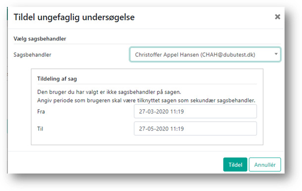 Hvis du tildeler den ungefaglige undersøgelse til en sagsbehandler, som ikke i forvejen er sagsbehandler på sagen, skal du angive hvilken periode, som den pågældende sagsbehandler skal være sekundær sagsbehandler på sagen. Du kan tildele sagen uden slutdato, ved at slette datoen i Til feltet.