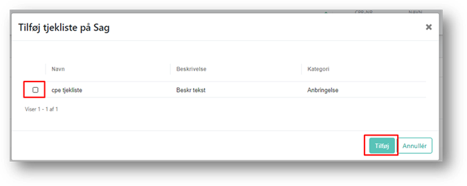 Klikker du på knappen Annullér, lukkes boksen uden at tjeklisten tilføjes til sagen.