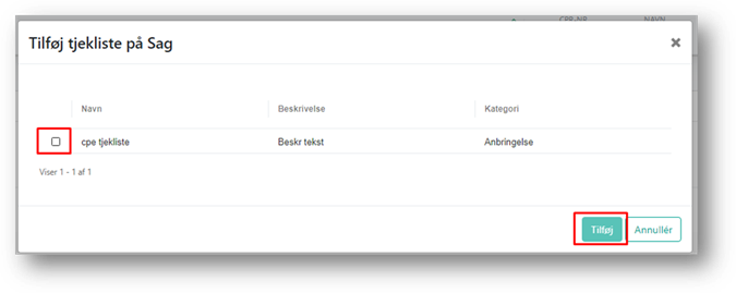 Systemet åbner en boks, hvor du kan vælge hvilken tjekliste, der skal tilføjes til sagen.