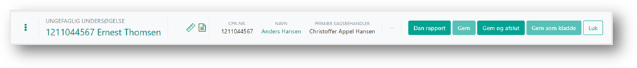 I toppen af den ungefaglige undersøgelse er der en menu, som du kan se, uanset hvor du befinder dig i den ungefaglige undersøgelse. Menuen består af oplysninger om den unge, hurtig navigation til fokusområderne, link til resultatdokumentation, vis udskrift, link til barnet/den unge og sagen, samt dan rapport, gem og luk knapperne.