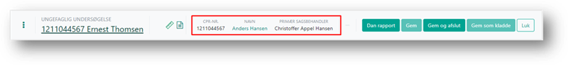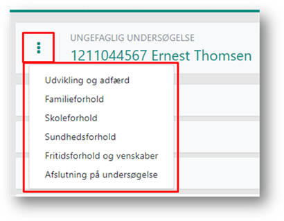 Topmenuen indeholder sagsnavn, som er et link, der åbner sagen på en ny fane. På den måde kan du se oplysninger på sagen i den ene fane, mens du kan arbejde med undersøgelsen i den anden fane.
