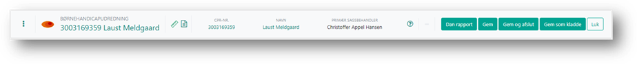 I toppen af udredningen er der en menu, der viser oplysninger om sagsnavn, link til resultatdokumentation, oplysninger om barnet/den unge og sagsbehandler.