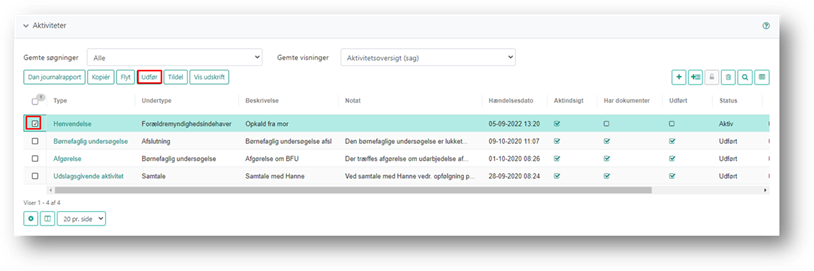 Du kan udføre aktiviteter fra fanen ”Aktiviteter” på sagen på flere forskellige måder. Aktiviteten vil herefter blive låst med det samme og kan ikke redigeres efterfølgende.