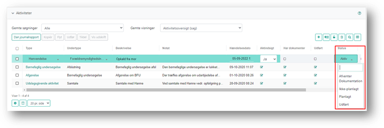 Den anden måde du kan udføre aktiviteter fra Aktivitetslisten på sagen, er ved at klikke i feltet ”Status” på aktiviteten.