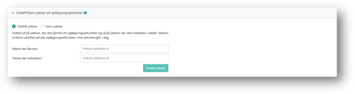 Hvis du skal udskifte en ydelse, skal ydelsen der fjernes og ydelsen der indsættes begge være godkendte, så ydelserne fremgår på en opfølgningsaktivitet. Du skal indtaste ID’et på den forkerte ydelse, der skal fjernes og ID’et på den korrekte ydelse, der skal indsættes i stedet.