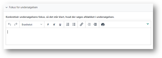 Du skal indtaste fokus for den ungefaglig undersøgelse. Det er muligt at benytte formatering, fx til at oprette punkttegn.