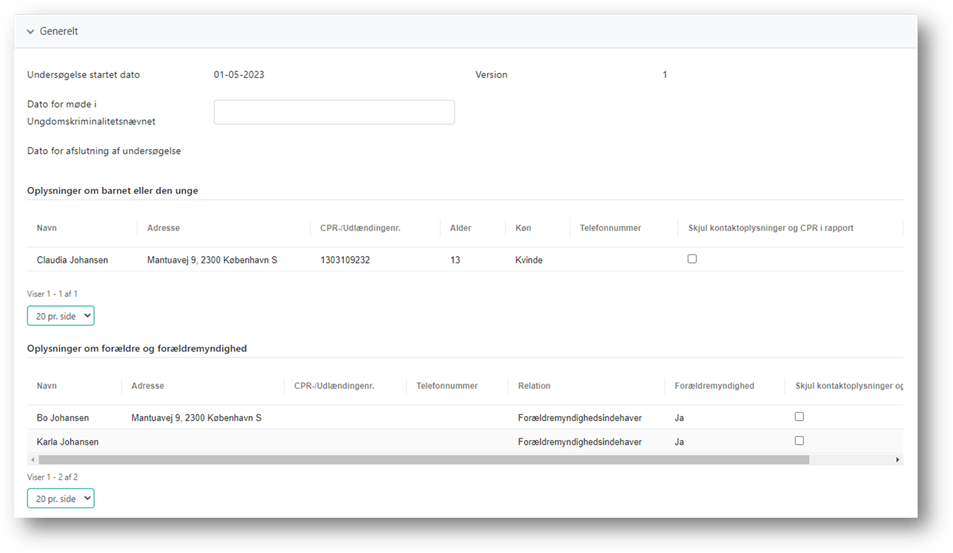 På fanen generelt vises oplysninger om Undersøgelsens startdato, Versionsnummer, dato for afslutning og oplysninger om barnet/den unge samt forældre og forældremyndighed.